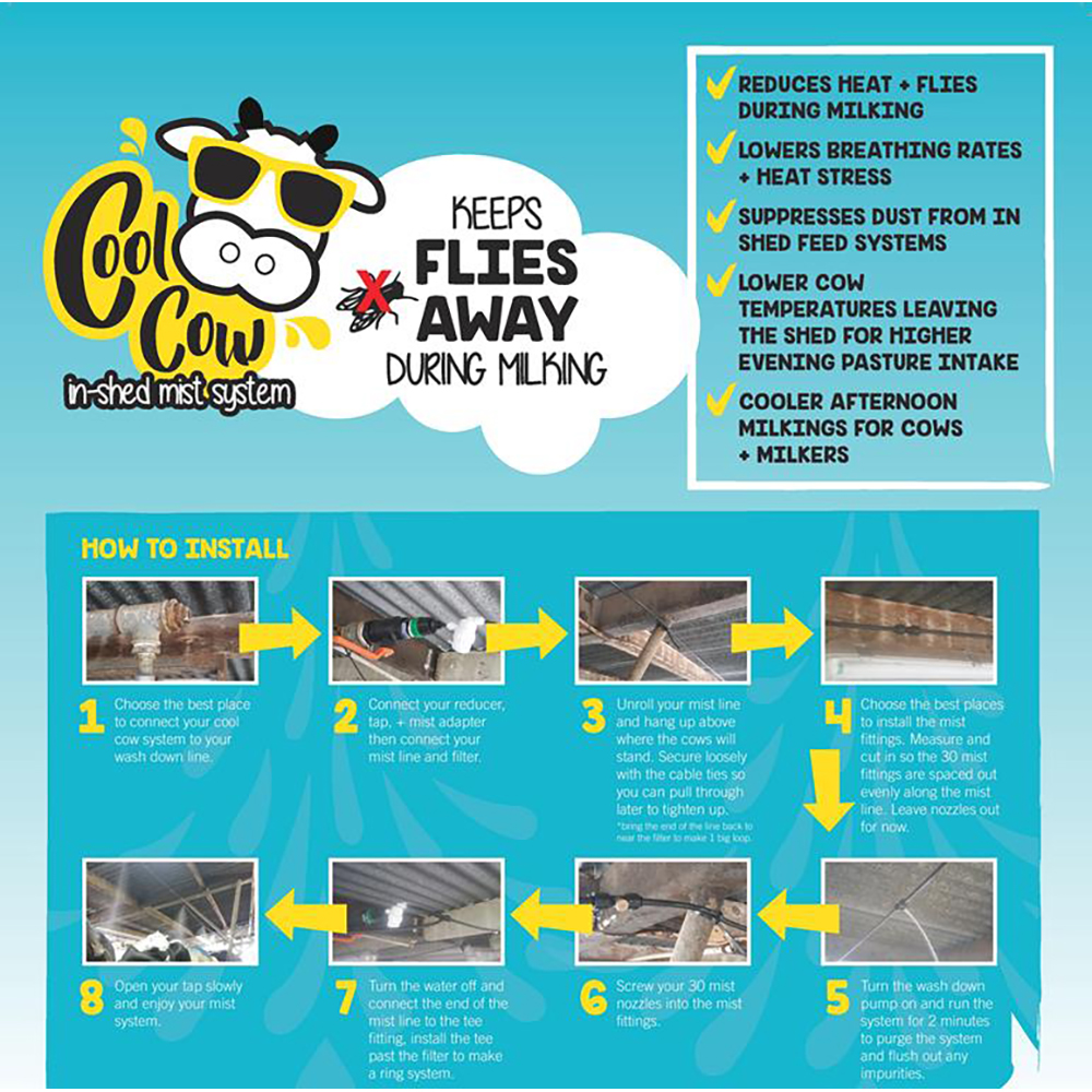 Reduce flies and heat with the Cool Cow Mister Kit for comfort in your dairy. Designed and made in New Zealand. Plumbs into washdown pump line with 65 m of heavy-wall delivery pipe.